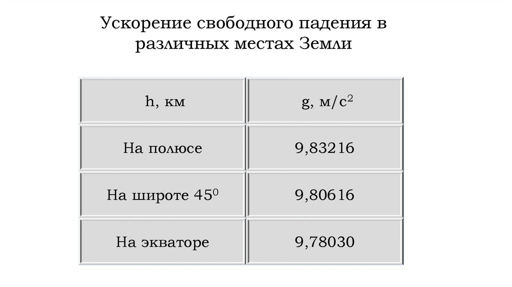 Ускорение свободного падения вразличных местах Земли