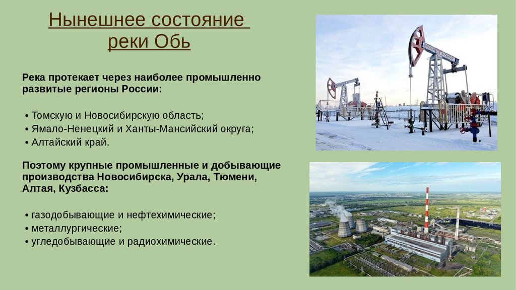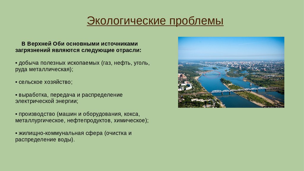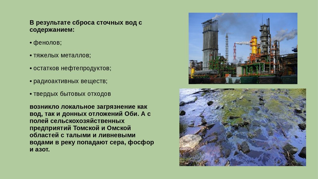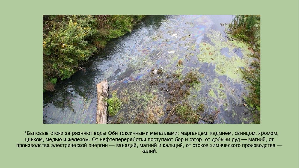 *Бытовые стоки загрязняют воды Оби токсичными металлами: марганцем, кадмием, свинцом, хромом,цинком, медью и железом. От нефтепереработки поступают бор и фтор, от добычи руд — магний, от