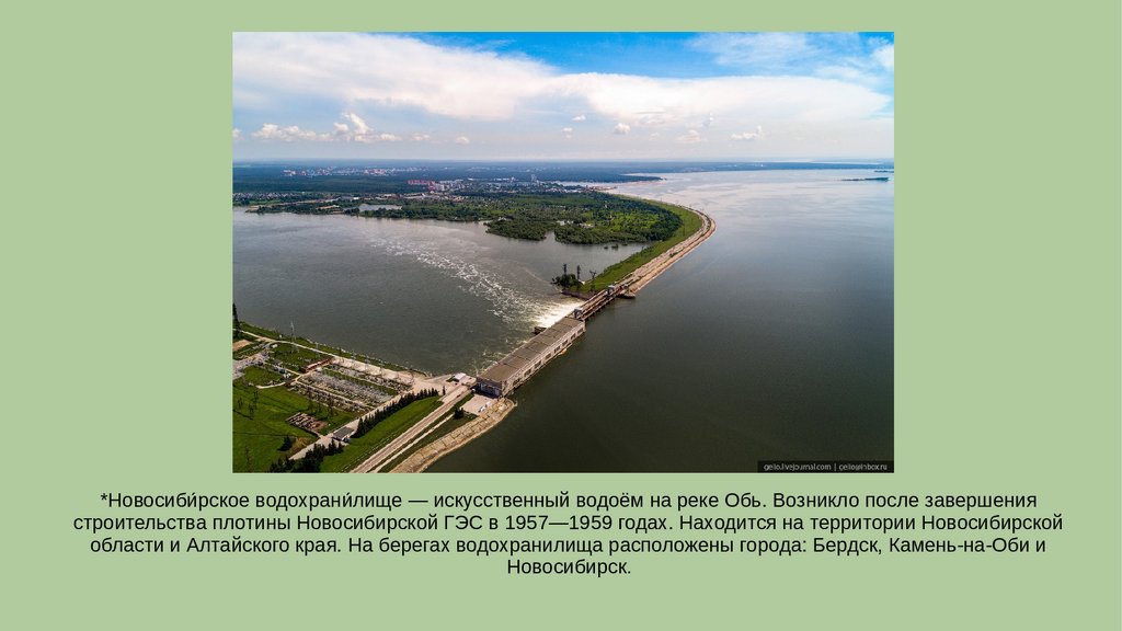 *Новосиби́ рское водохрани́ лище — искусственный водоём на реке Обь. Возникло после завершениястроительства плотины Новосибирской ГЭС в 1957—1959 годах. Находится на территории Новосибирской