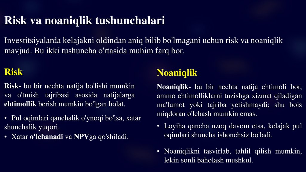 Risk va noaniqlik tushunchalariInvestitsiyalarda kelajakni oldindan aniq bilib bo'lmagani uchun risk va noaniqlik