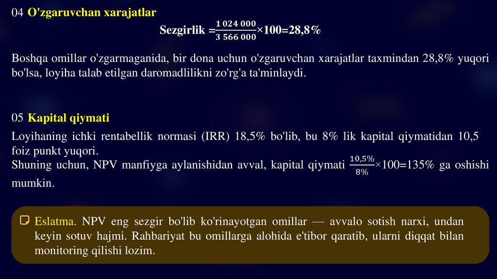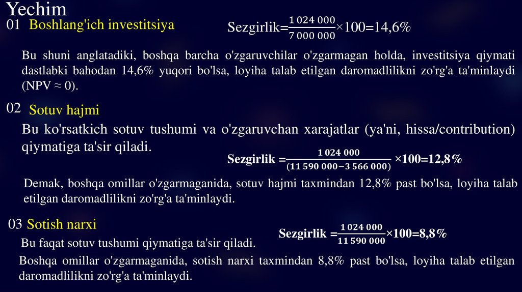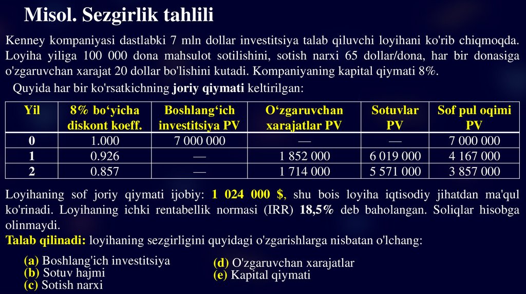 o'zgarishini ko'ramiz. Maqsad — NPVni nolga tushiradigan o'sha omilning zarur o'zgarish