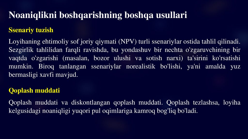 NPV ko'plab noaniq omillarga bog'liq (narx, hajm, xarajat va hokazo), shuning uchun bu tahlil