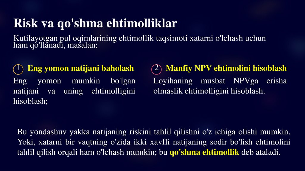 mumkin; u kutilayotgan NPVni hisoblash va riskni