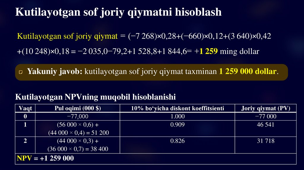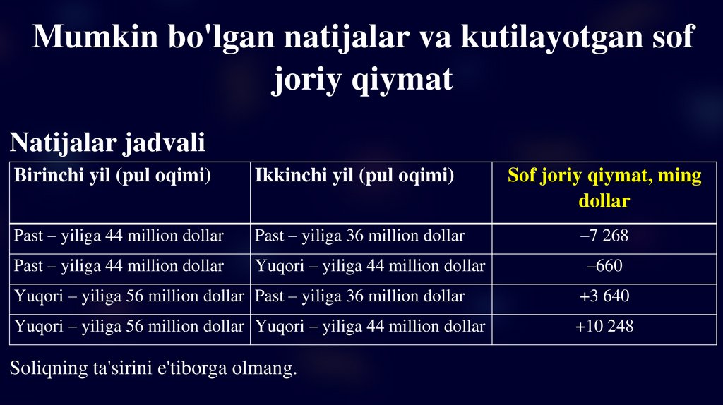 Mumkin bo'lgan natijalar va kutilayotgan sofjoriy qiymat