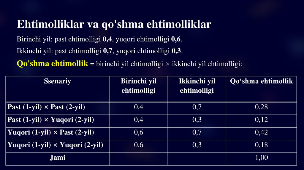 Ehtimolliklar va qo'shma ehtimolliklarBirinchi yil: past ehtimolligi 0,4, yuqori ehtimolligi 0,6.