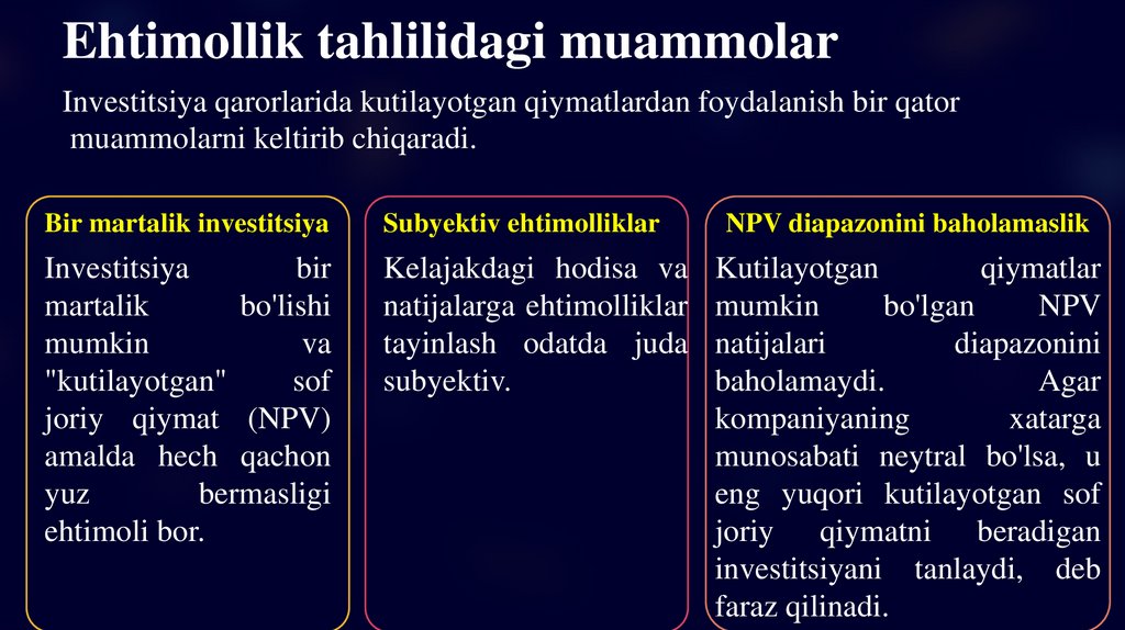 Ehtimollik tahlilidagi muammolarInvestitsiya qarorlarida kutilayotgan qiymatlardan foydalanish bir qator