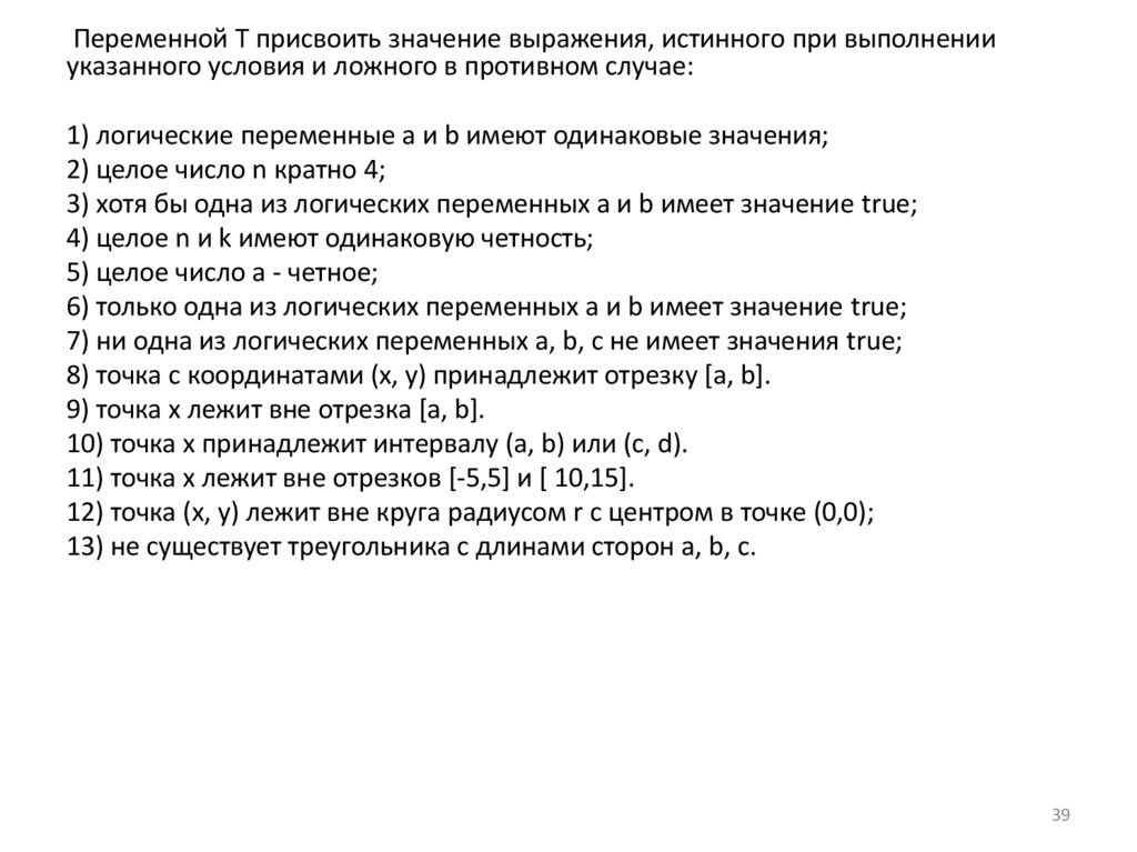 Переменной T присвоить значение выражения, истинного при выполненииуказанного условия и ложного в противном случае: