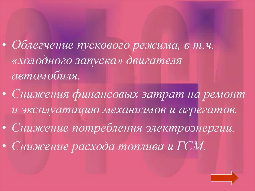 • Облегчение пускового режима, в т.ч.«холодного запуска» двигателя