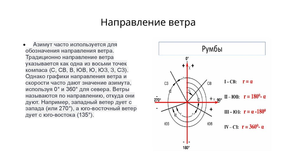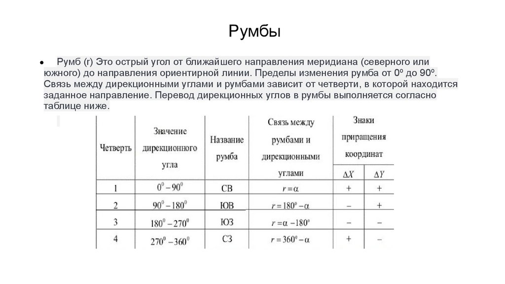 РумбыРумб (r) Это острый угол от ближайшего направления меридиана (северного или