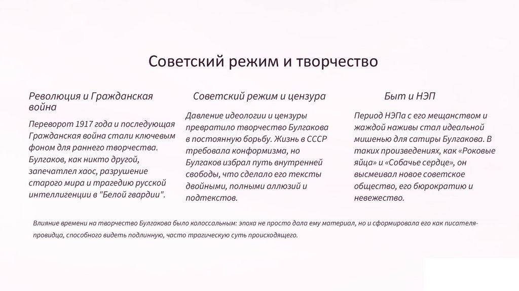 Влияние времени на творчество Булгакова было колоссальным: эпоха не просто дала ему материал, но и сформировала его как писателяпровидца, способного видеть подлинную, часто трагическую суть происходящего.