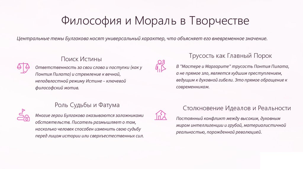 Философия и Мораль в ТворчествеЦентральные темы Булгакова носят универсальный характер, что объясняет его вневременное значение.