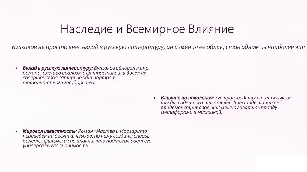 Наследие и Всемирное ВлияниеБулгаков не просто внес вклад в русскую литературу, он изменил её облик, став одним из наиболее чита