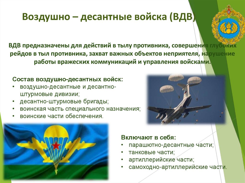 Воздушно – десантные войска (ВДВ)ВДВ предназначены для действий в тылу противника, совершения глубоких