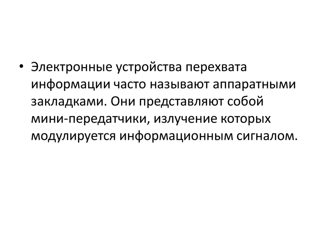 • Электронные устройства перехватаинформации часто называют аппаратными