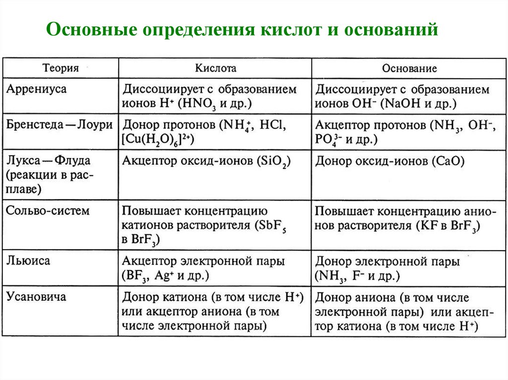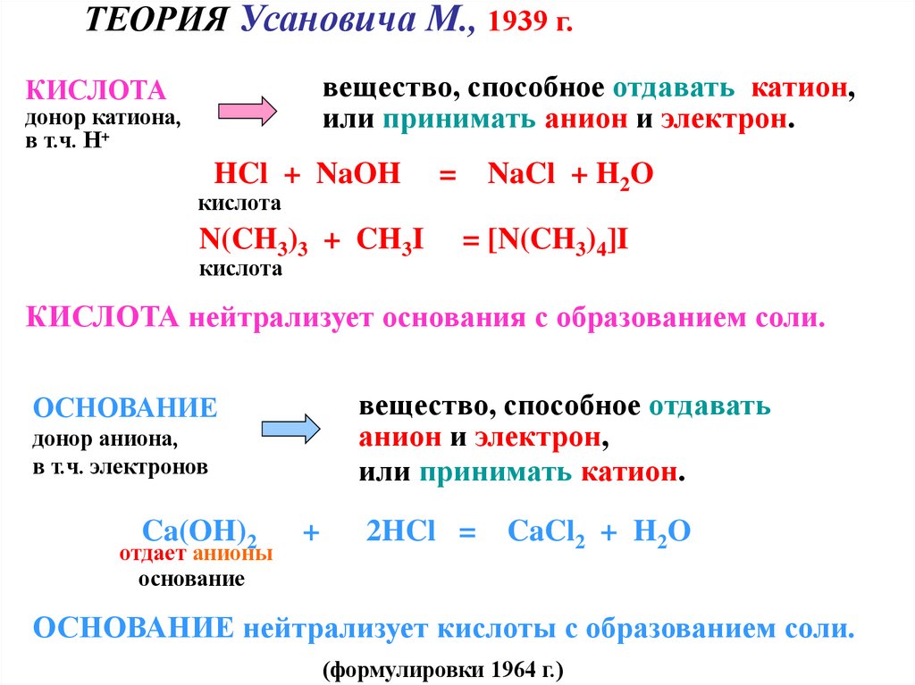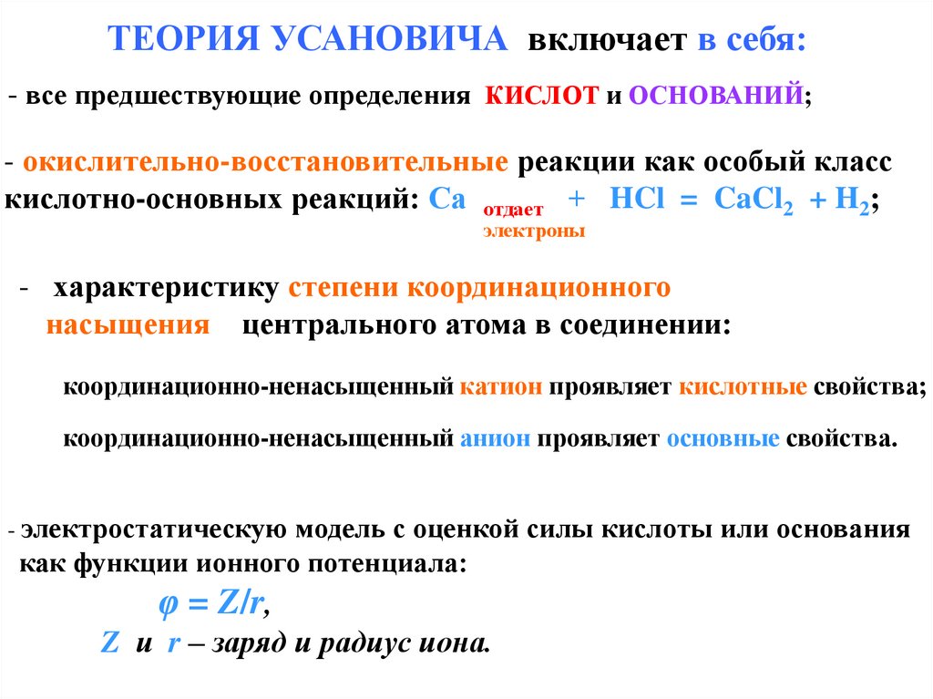 ТЕОРИЯ УСАНОВИЧА включает в себя:- все предшествующие определения КИСЛОТ и ОСНОВАНИЙ;