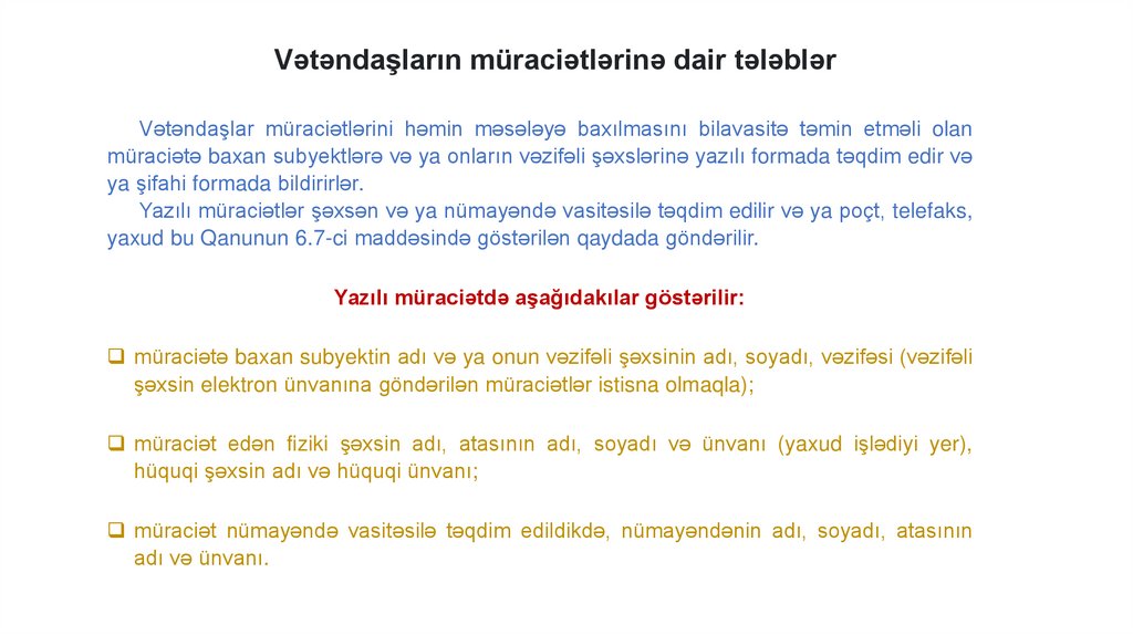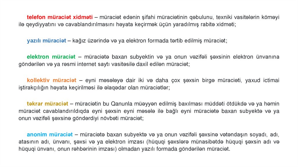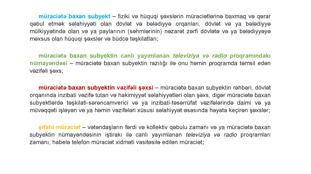 müraciət – müraciətə baxan subyektə və ya onun vəzifəli şəxsinə şəxsən və ya