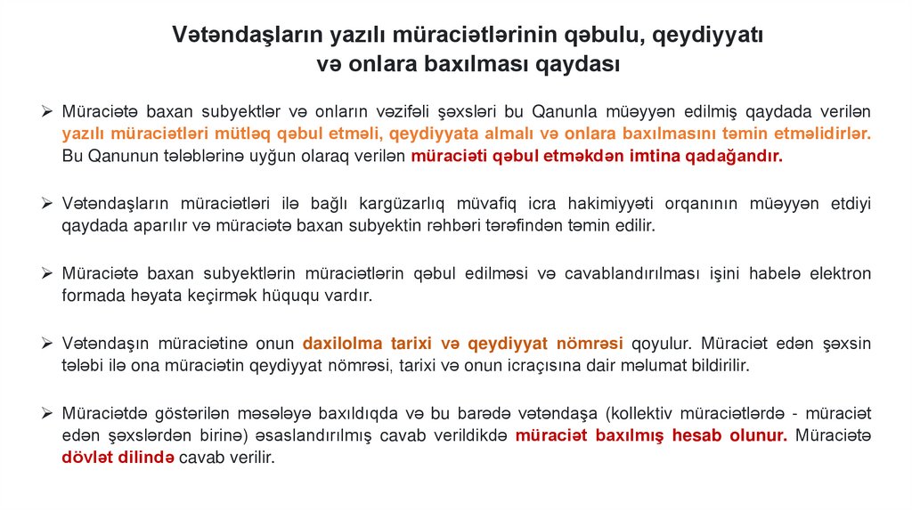 bağlı münasibətləri tənzimləyir, vəzifəli şəxslərin müraciətlərə baxması qaydasını müəyyən edir.