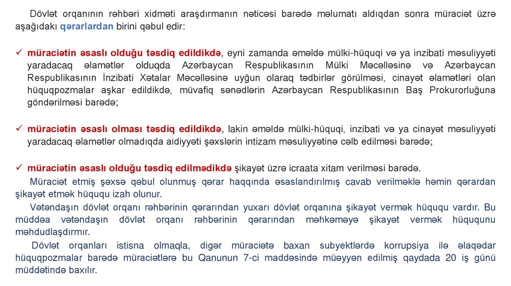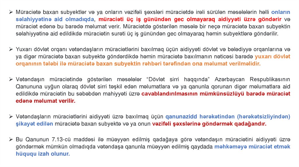 müraciətə baxan subyektlərin və ya onların vəzifəli şəxslərinin Qanunla müəyyən edilmiş qaydada