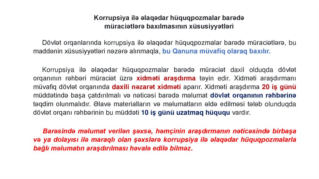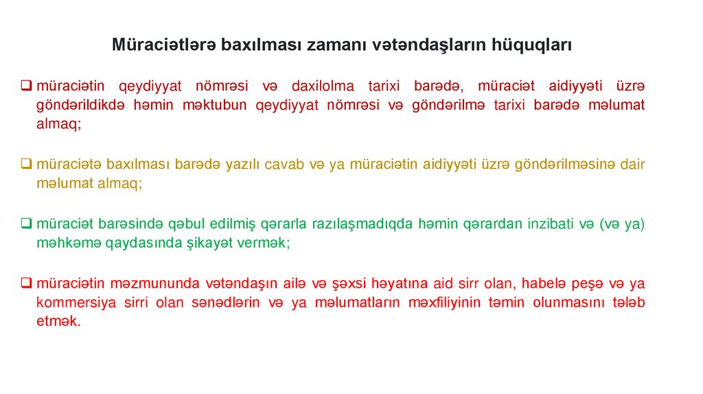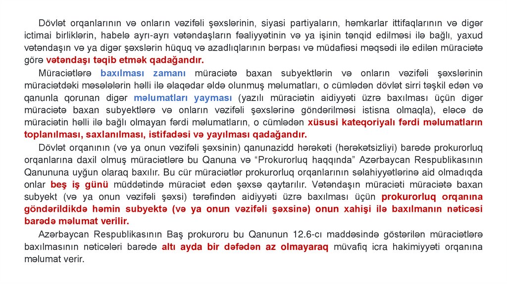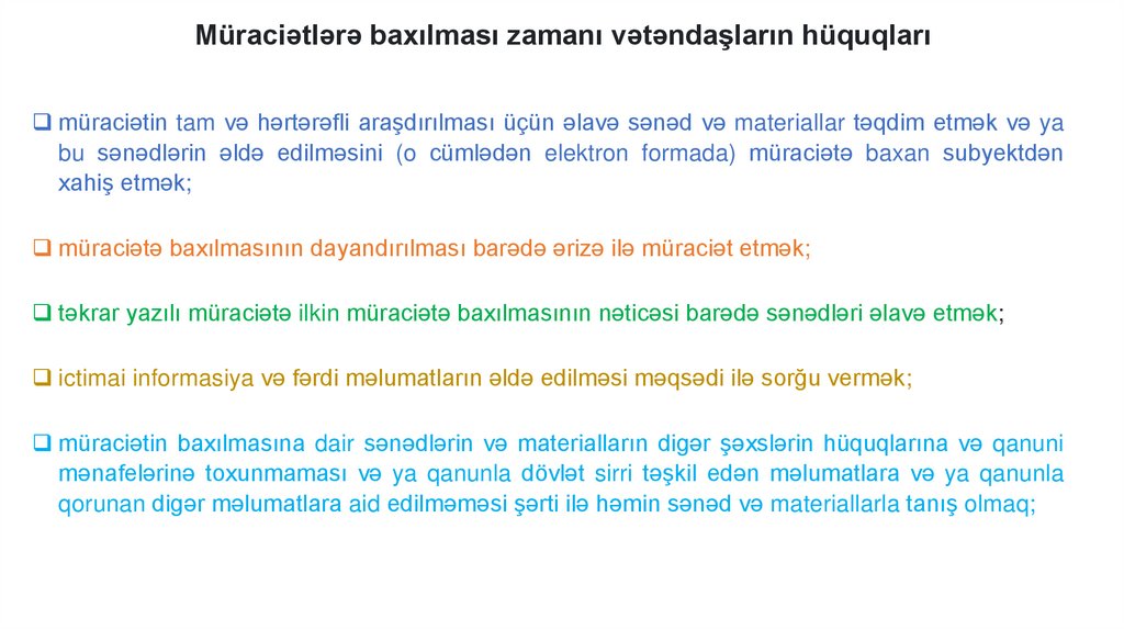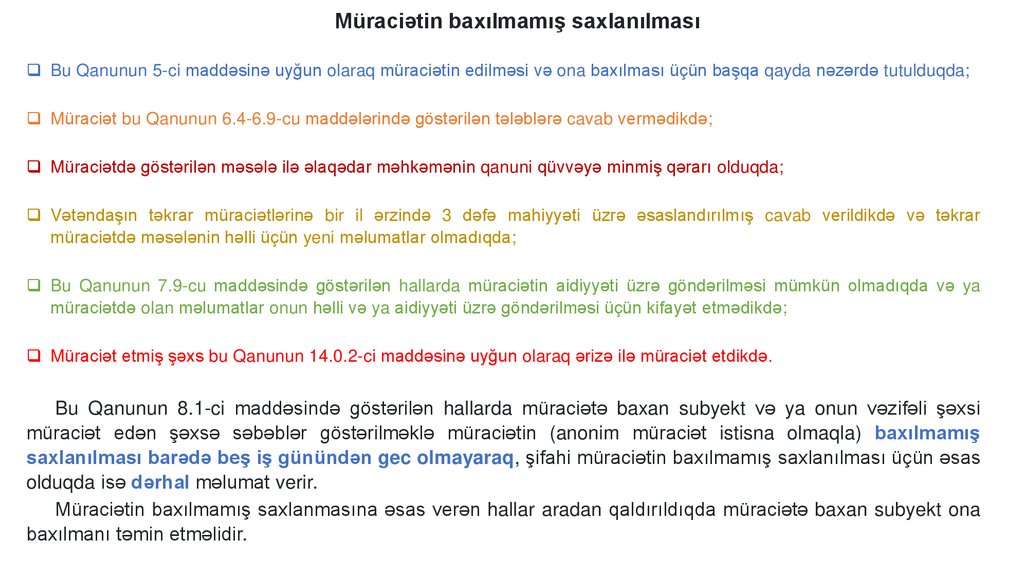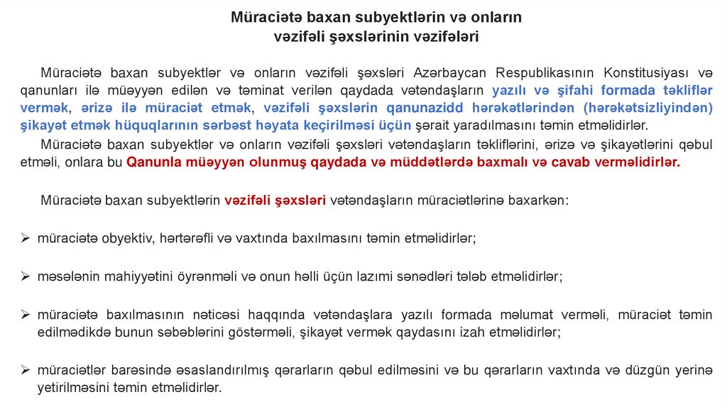müraciətlərə baxılması zamanı müraciətə baxan subyektlərin və onların vəzifəli şəxslərinin müraciətdəki