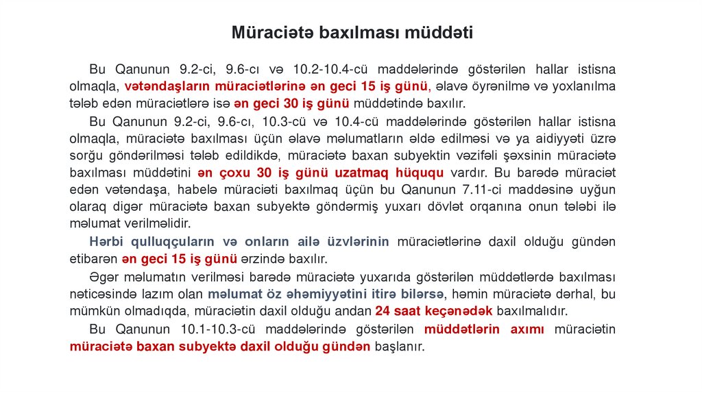 Müraciətlərə Qanunla müəyyən edilmiş müddətdə mahiyyəti üzrə baxılması və onların