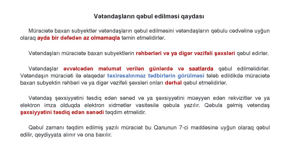 müraciətə baxan subyektlər və ya onların vəzifəli şəxsləri tərəfindən vətəndaşların qəbulunun təşkili və