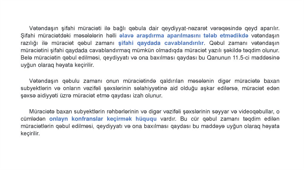 şifahi müraciət – vətəndaşların fərdi və kollektiv qəbulu zamanı və ya müraciətə baxan