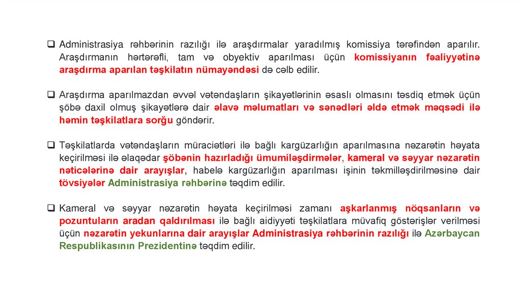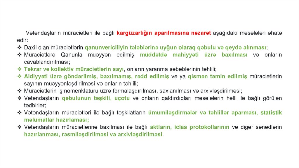 Vətəndaşların müraciətləri ilə bağlı kargüzarlığın aparılmasına nəzarət aşağıdakı məsələləri əhatəedir:
