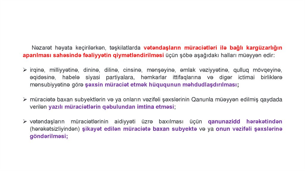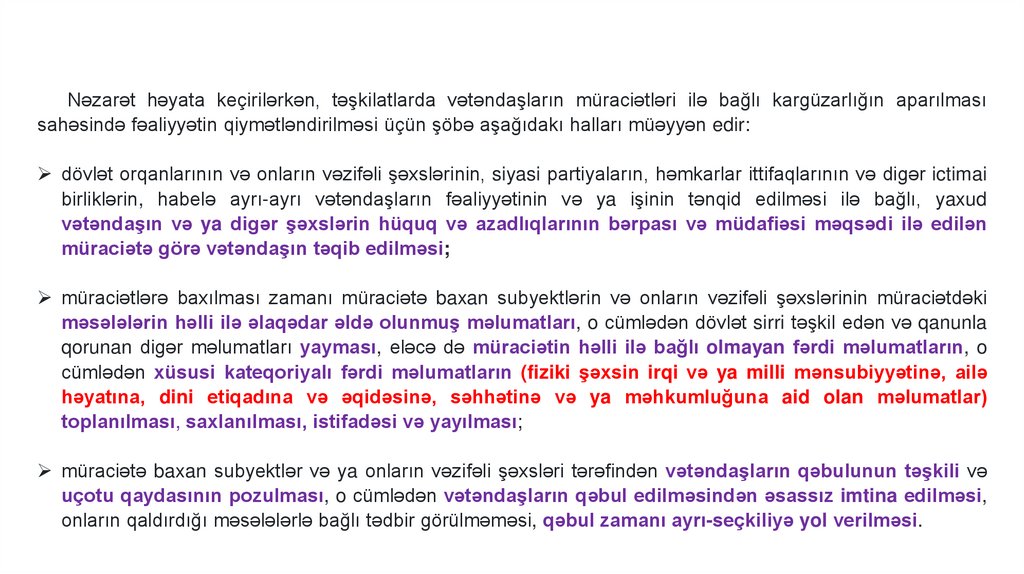 Nəzarət həyata keçirilərkən, təşkilatlarda vətəndaşların müraciətləri ilə bağlı kargüzarlığınaparılması sahəsində fəaliyyətin qiymətləndirilməsi üçün şöbə aşağıdakı halları müəyyən edir:
