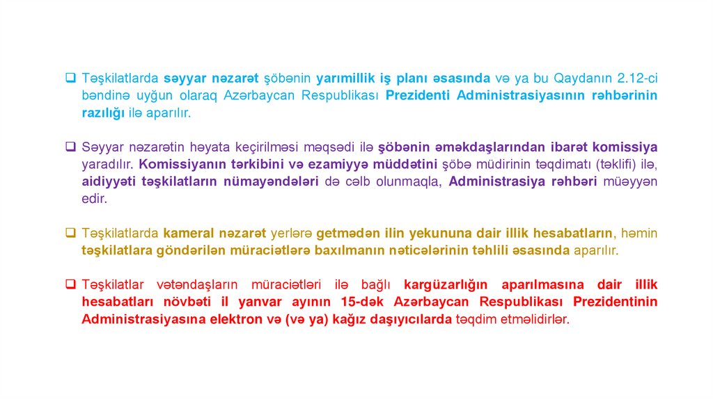 Təşkilatlarda səyyar nəzarət şöbənin yarımillik iş planı əsasında və ya bu Qaydanın 2.12-cibəndinə uyğun olaraq Azərbaycan Respublikası Prezidenti Administrasiyasının rəhbərinin