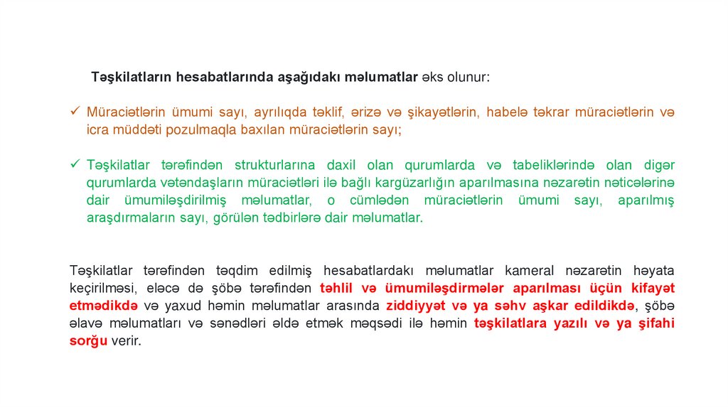Təşkilatların hesabatlarında aşağıdakı məlumatlar əks olunur:Müraciətlərin ümumi sayı, ayrılıqda təklif, ərizə və şikayətlərin, habelə təkrar müraciətlərin və