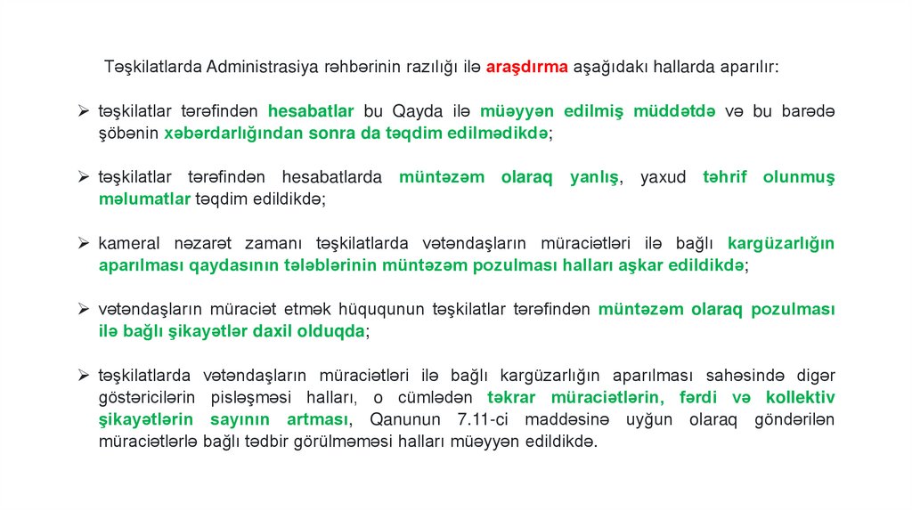 Təşkilatlarda Administrasiya rəhbərinin razılığı ilə araşdırma aşağıdakı hallarda aparılır:təşkilatlar tərəfindən hesabatlar bu Qayda ilə müəyyən edilmiş müddətdə və bu barədə