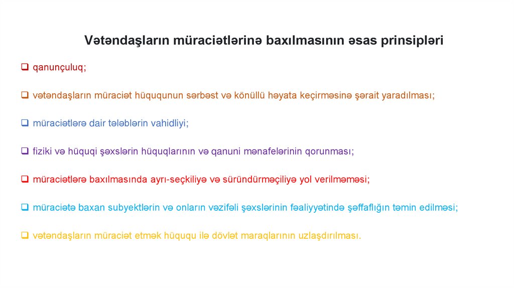 Vətəndaşların müraciətlərinə baxılmasının əsas prinsipləriqanunçuluq;