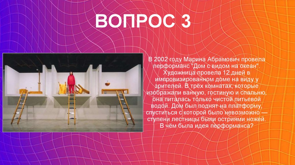 ВОПРОС 3В 2002 году Марина Абрамович провела
