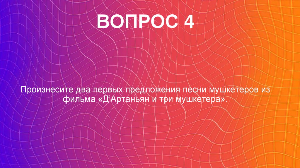 ВОПРОС 4Произнесите два первых предложения песни мушкетеров из