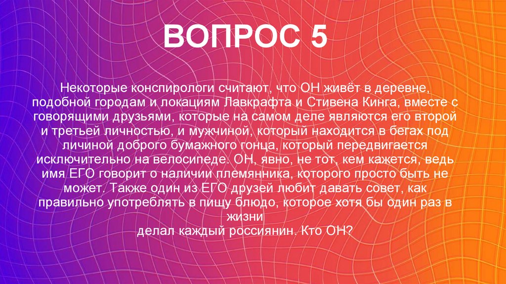 ВОПРОС 5Некоторые конспирологи считают, что ОН живёт в деревне,