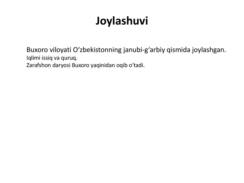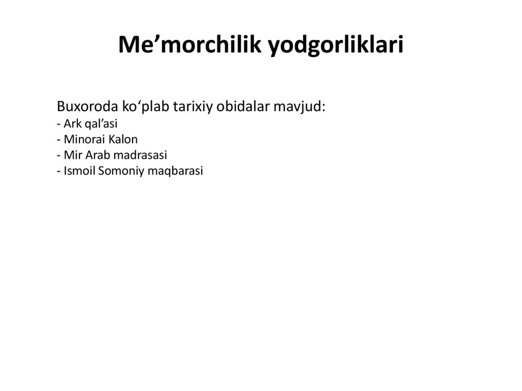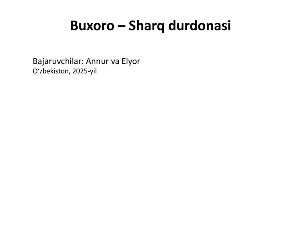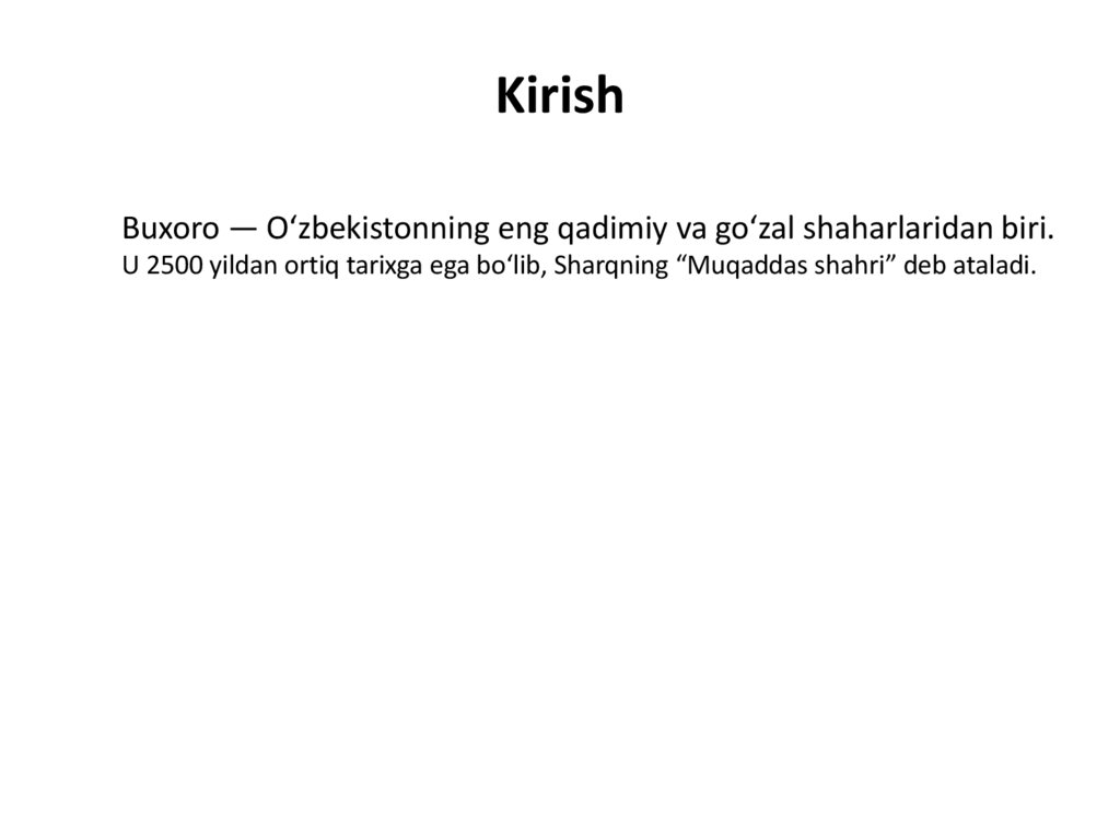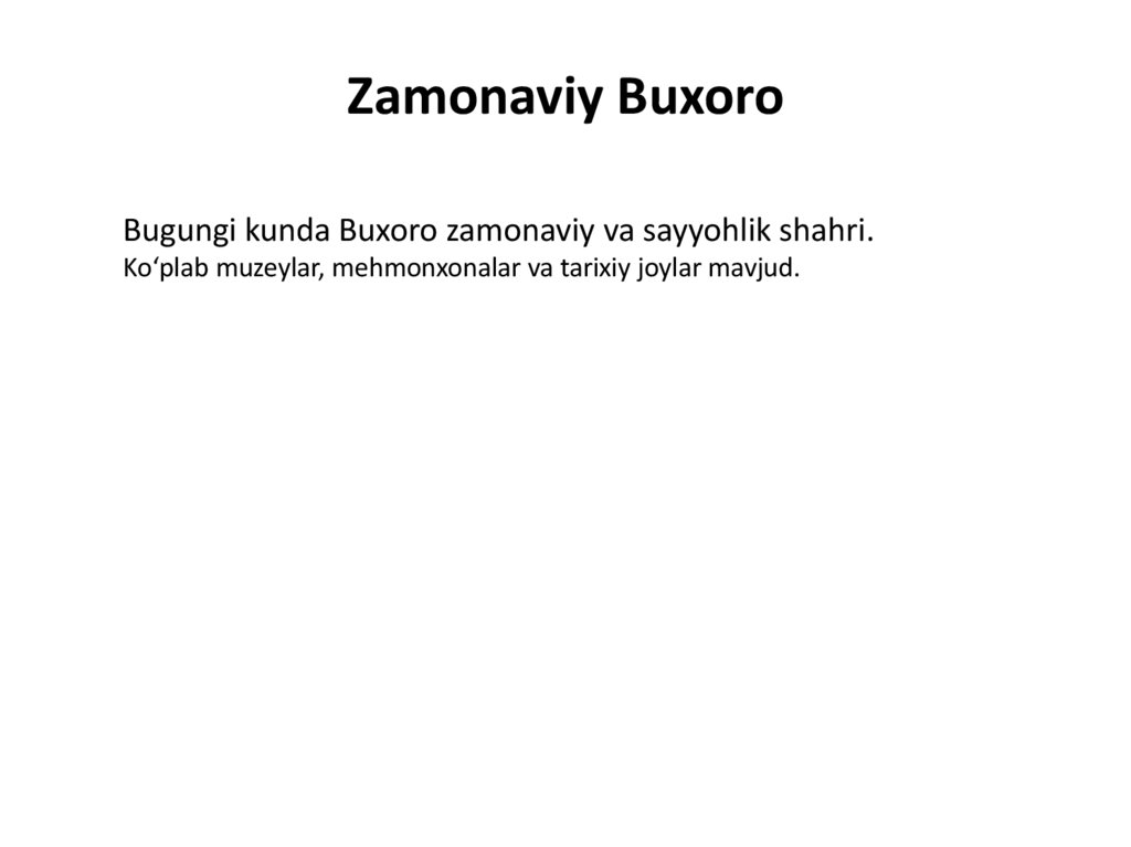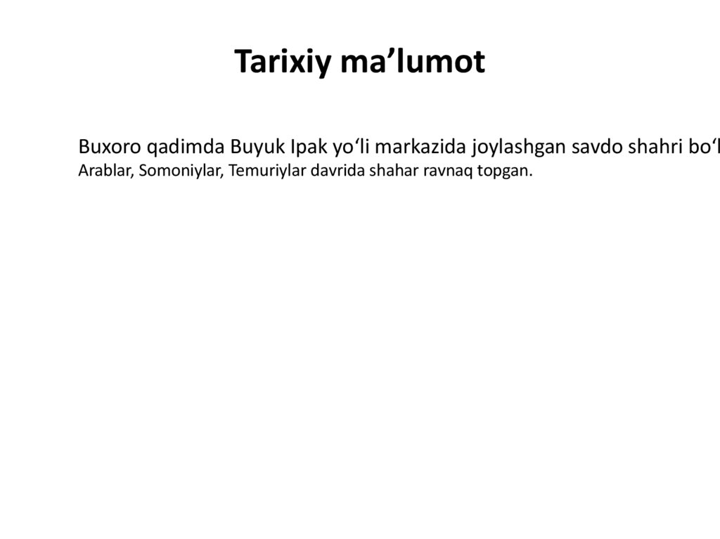 Tarixiy ma’lumotBuxoro qadimda Buyuk Ipak yo‘li markazida joylashgan savdo shahri bo‘l