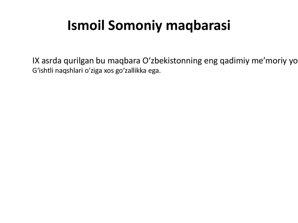 Ismoil Somoniy maqbarasiIX asrda qurilgan bu maqbara O‘zbekistonning eng qadimiy me’moriy yod
