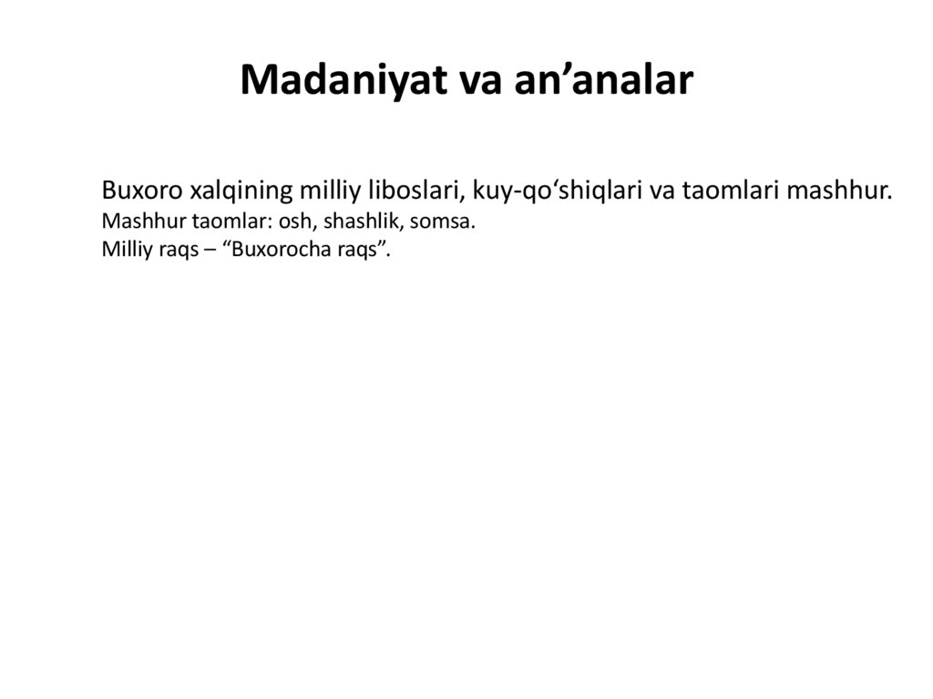 Madaniyat va an’analarBuxoro xalqining milliy liboslari, kuy-qo‘shiqlari va taomlari mashhur.