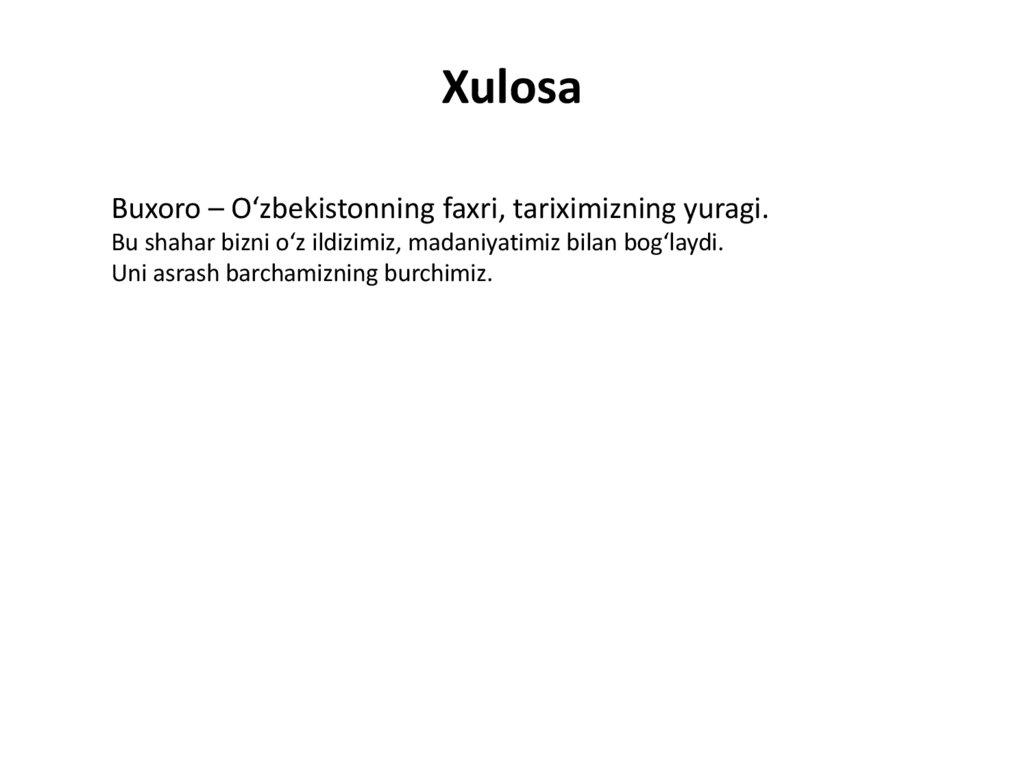 XulosaBuxoro – O‘zbekistonning faxri, tariximizning yuragi.