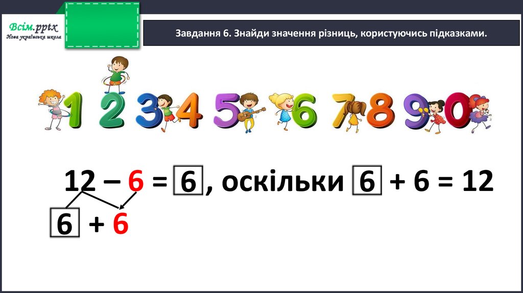 Завдання 6. Знайди значення різниць, користуючись підказками.12 – 6 = 6 , оскільки 6 + 6 = 12