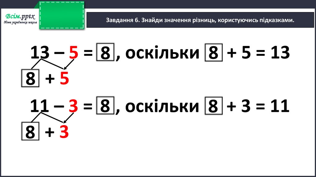 Завдання 6. Знайди значення різниць, користуючись підказками.13 – 5 = 8 , оскільки 8 + 5 = 13