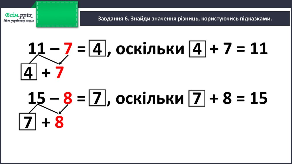 Завдання 6. Знайди значення різниць, користуючись підказками.11 – 7 = 4 , оскільки 4 + 7 = 11