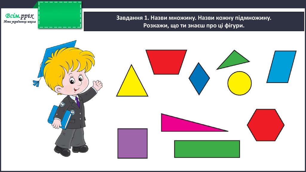 Завдання 1. Назви множину. Назви кожну підмножину.Розкажи, що ти знаєш про ці фігури.