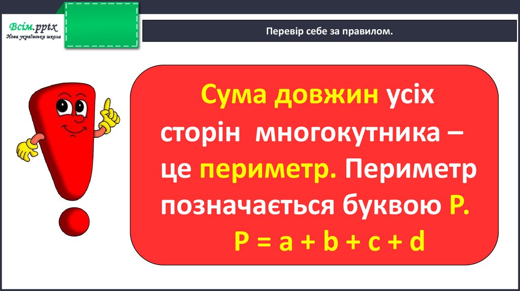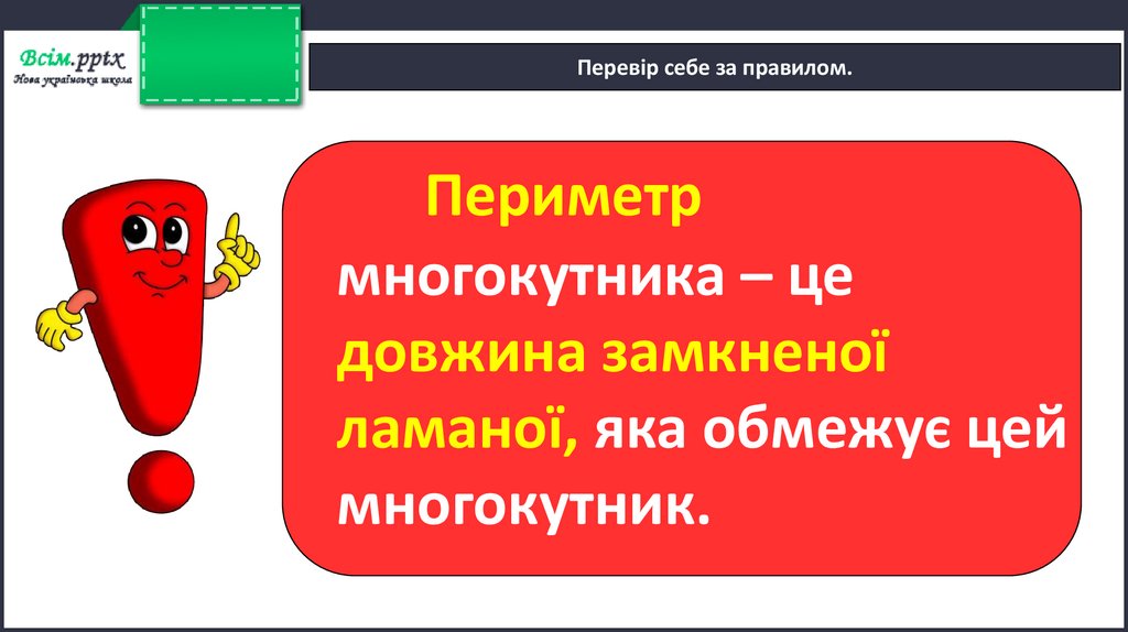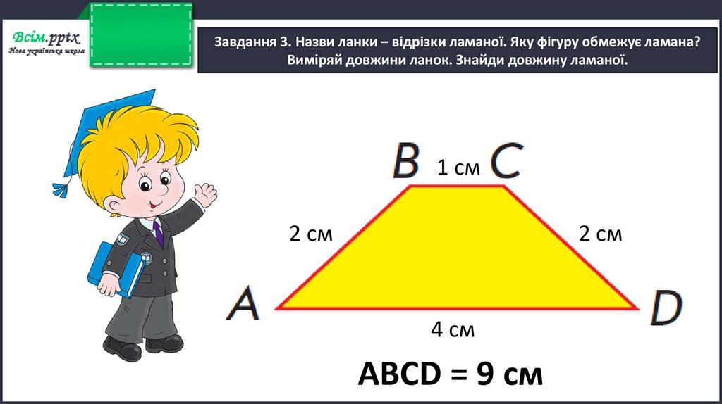 Завдання 3. Назви ланки – відрізки ламаної. Яку фігуру обмежує ламана?Виміряй довжини ланок. Знайди довжину ламаної.
