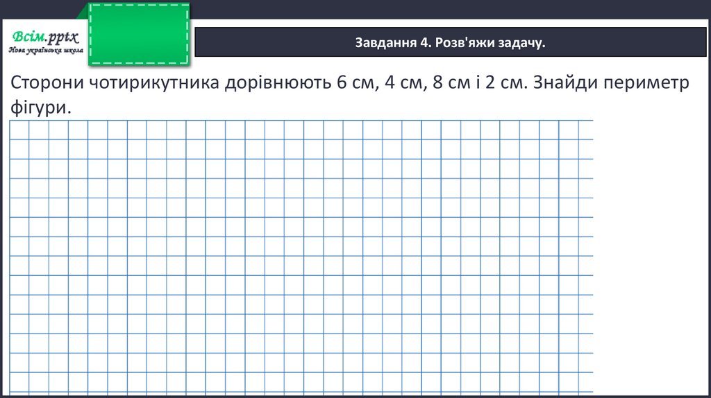 Завдання 4. Розв'яжи задачу.Сторони чотирикутника дорівнюють 6 см, 4 см, 8 см і 2 см. Знайди периметр
