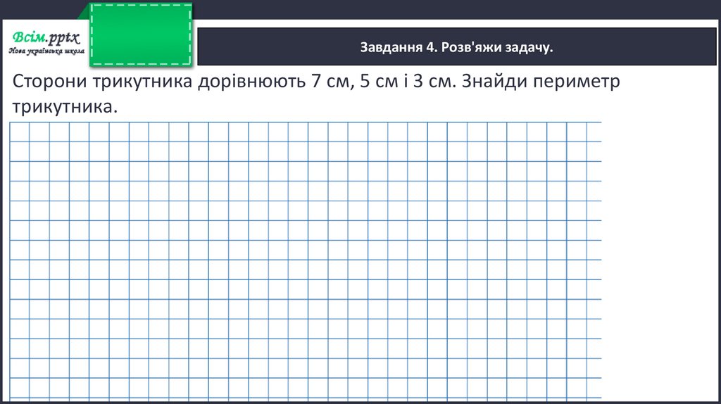 Завдання 4. Розв'яжи задачу.Сторони трикутника дорівнюють 7 см, 5 см і 3 см. Знайди периметр