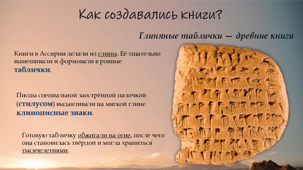 Глиняные таблички — древние книгиКниги в Ассирии делали из глины. Её тщательно