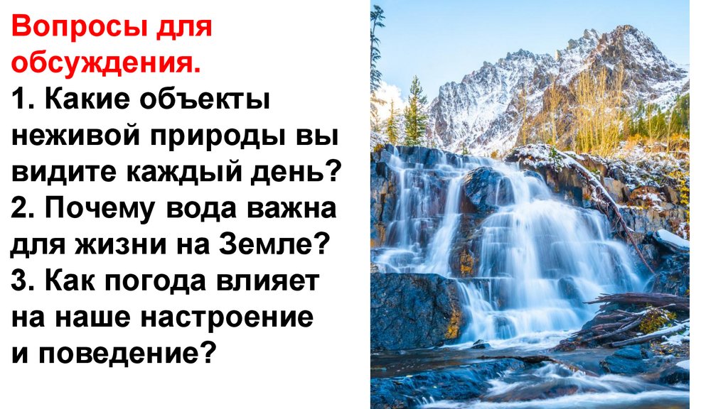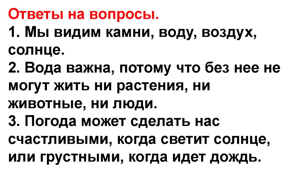 Ответы на вопросы.1. Мы видим камни, воду, воздух,