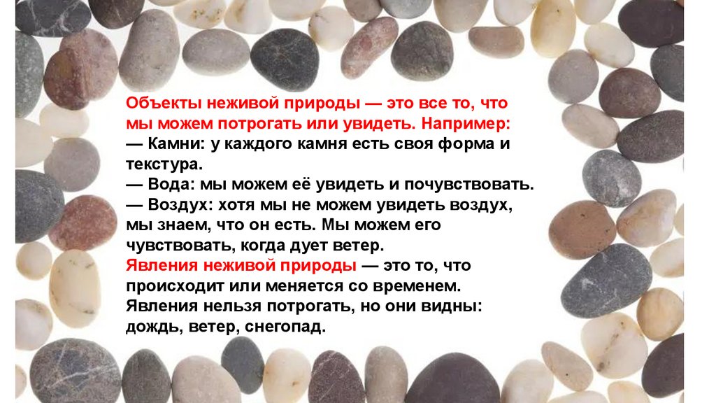 Объекты неживой природы — это все то, чтомы можем потрогать или увидеть. Например:
