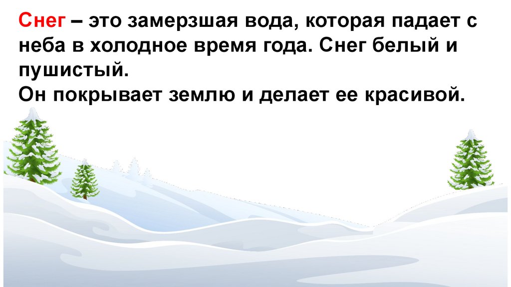 Снег – это замерзшая вода, которая падает снеба в холодное время года. Снег белый и